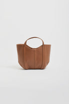 The Stitch Curved Bag in Tan is crafted from vegan leather with a semi-structured silhouette. It features top handles, panel detailing, a magnetic closure, and a flat base, with an internal pouch and optional cross-body strap.