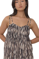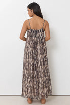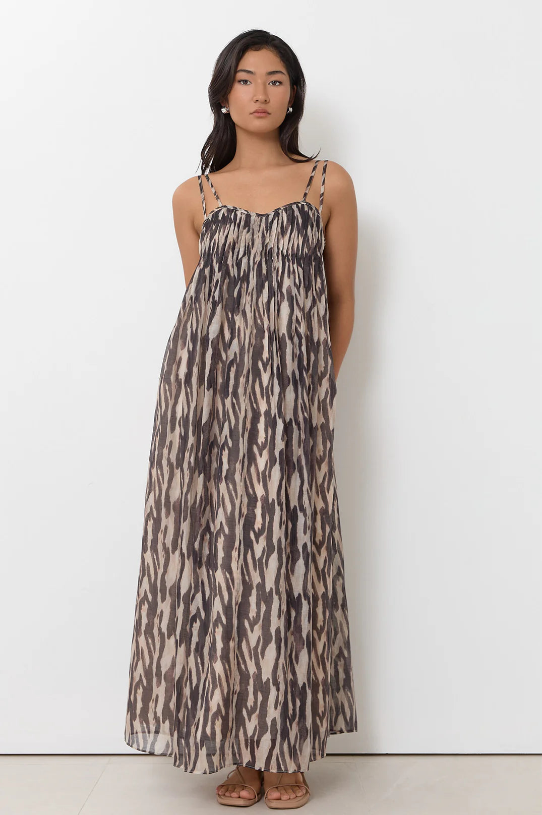 The Indra Pintuck Maxi Dress (Zebra) is a relaxed, feminine silhouette. It features a sweetheart neckline, adjustable straps, and delicate pintuck detailing, finished with contrast stitching and a button-and-loop back closure.