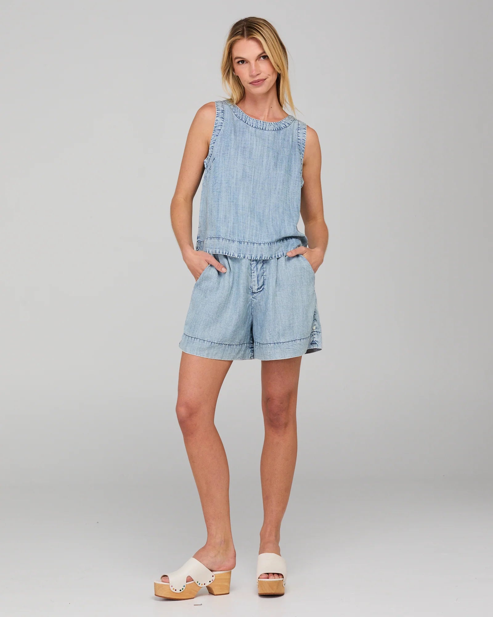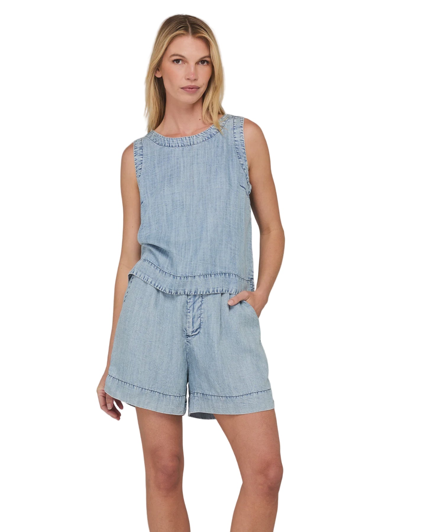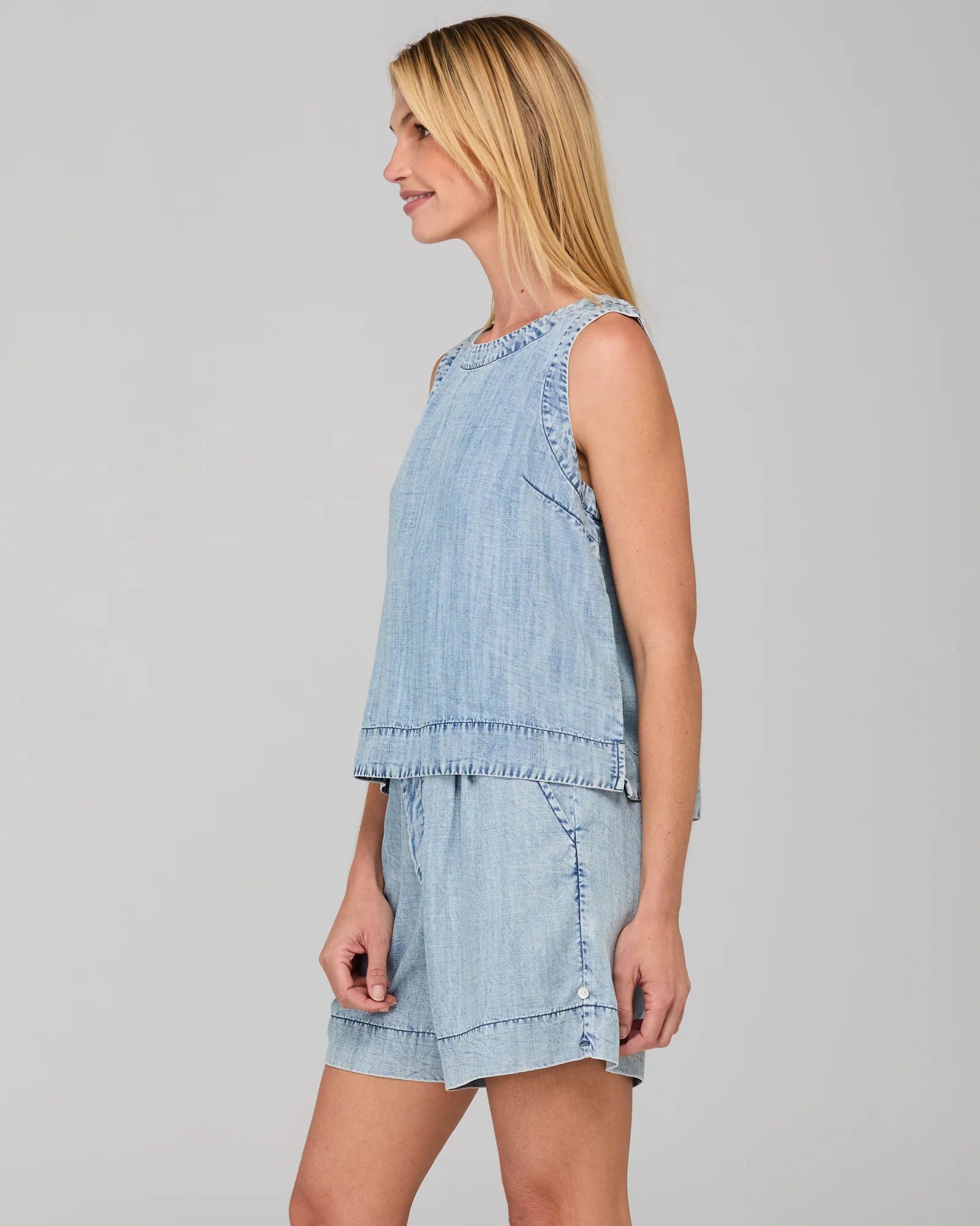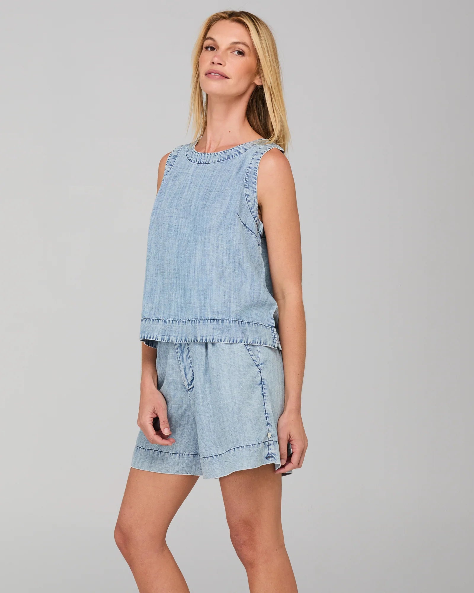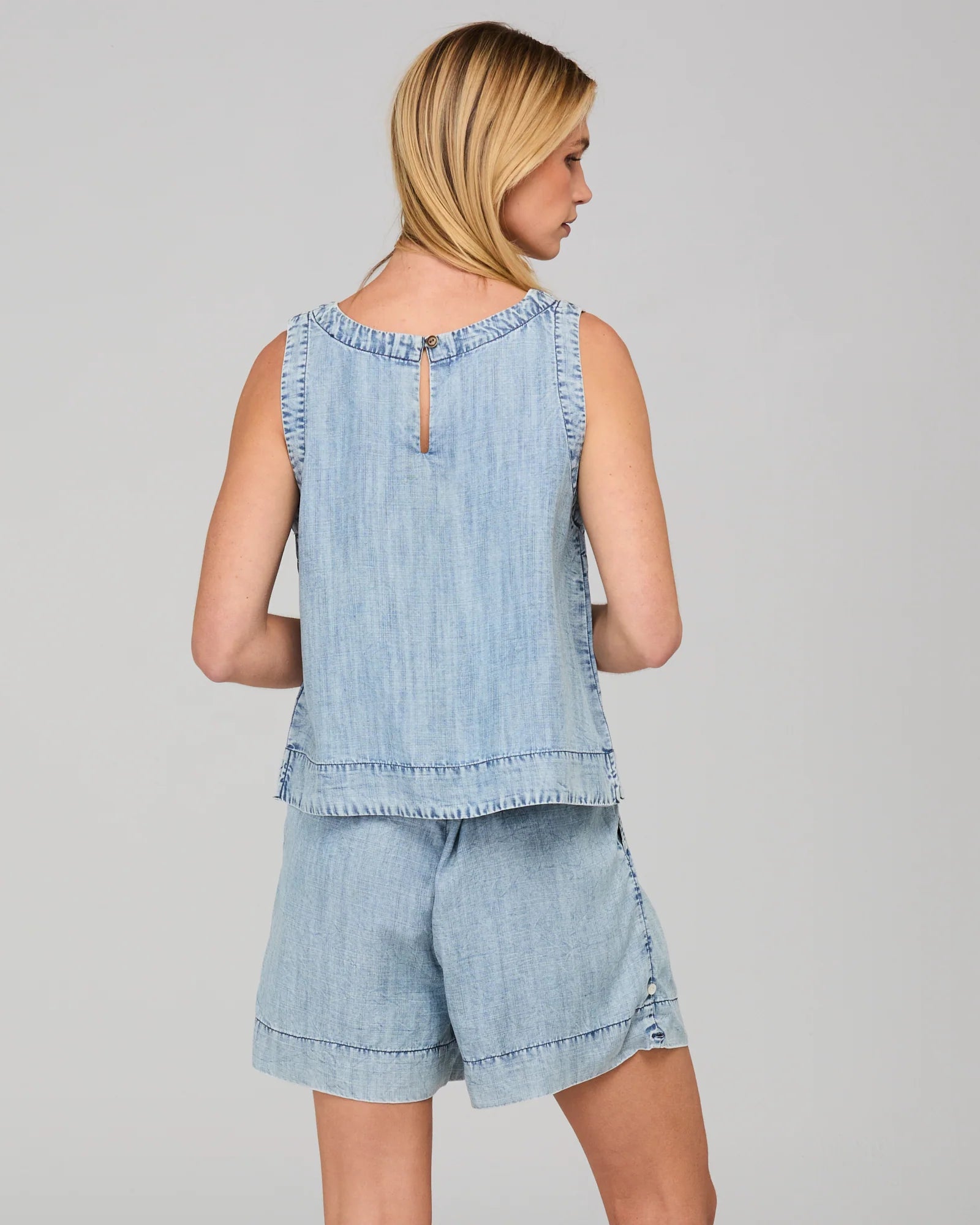 100% Lyocell with denim wash, round neckline, cropped length and back neck keyhole opening with button.