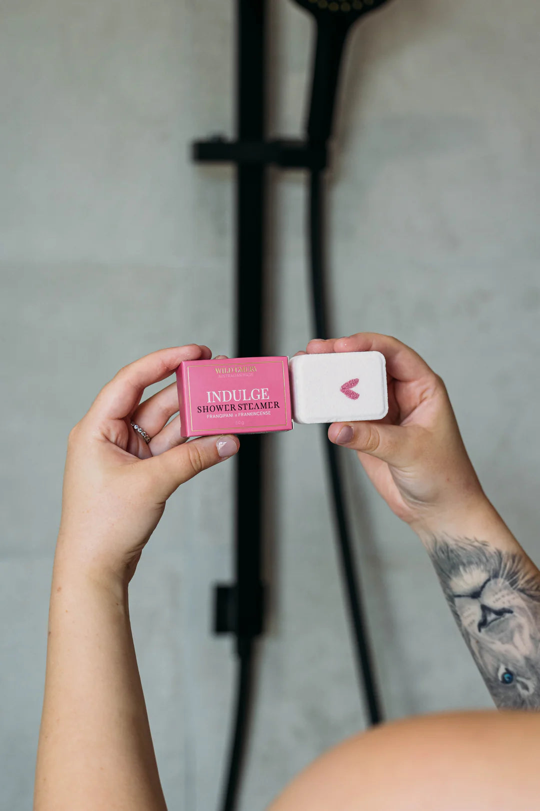 Our INDULGE shower steamer is a beautiful sweet, floral, burst of frangipani's with a touch of grounding spicy frankincense. Bring some well deserved indulgence into your everyday with our INDULGE essential oil shower steamer.